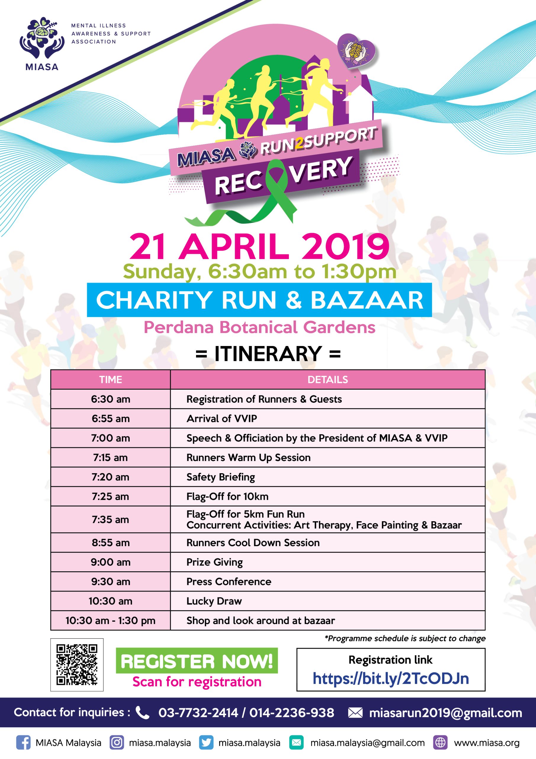 Come join us for our upcoming fundraising event – ‘MIASA Run2Support Recovery’ programme. Come join us for this charity run & bazaar and help us create awareness on mental wellness & mental illness, and to raise funds for the cause of mental health advocacy work. Details are as follows: