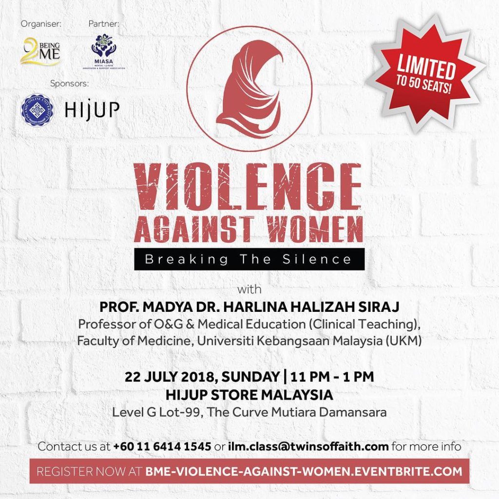 We’re happy to announce that in collaboration with Being ME, we’ll be conducting a talk on “VIOLENCE AGAINST WOMEN: BREAKING THE SILENCE” on July 22, 2018 (Sunday). We will be discussing on violence against women and how its impact ranges from immediate to long-term multiple physical, sexual and mental consequences for women including death. Not only it negatively affects women’s general well-being, but also have negative consequences to their families, the community and the country at large. The talk will be delivered by Prof. Madya Dr. Harlina Halizah Siraj.