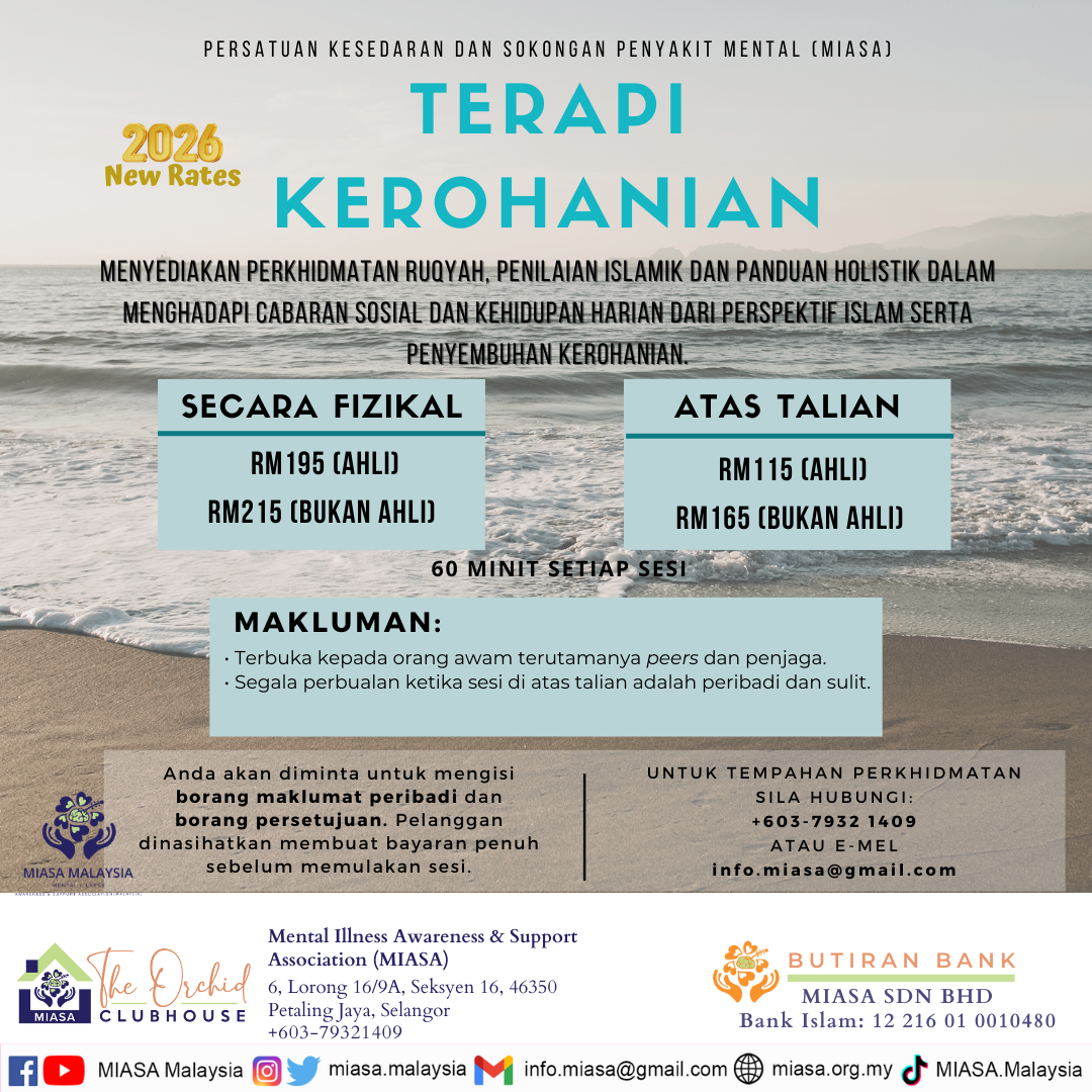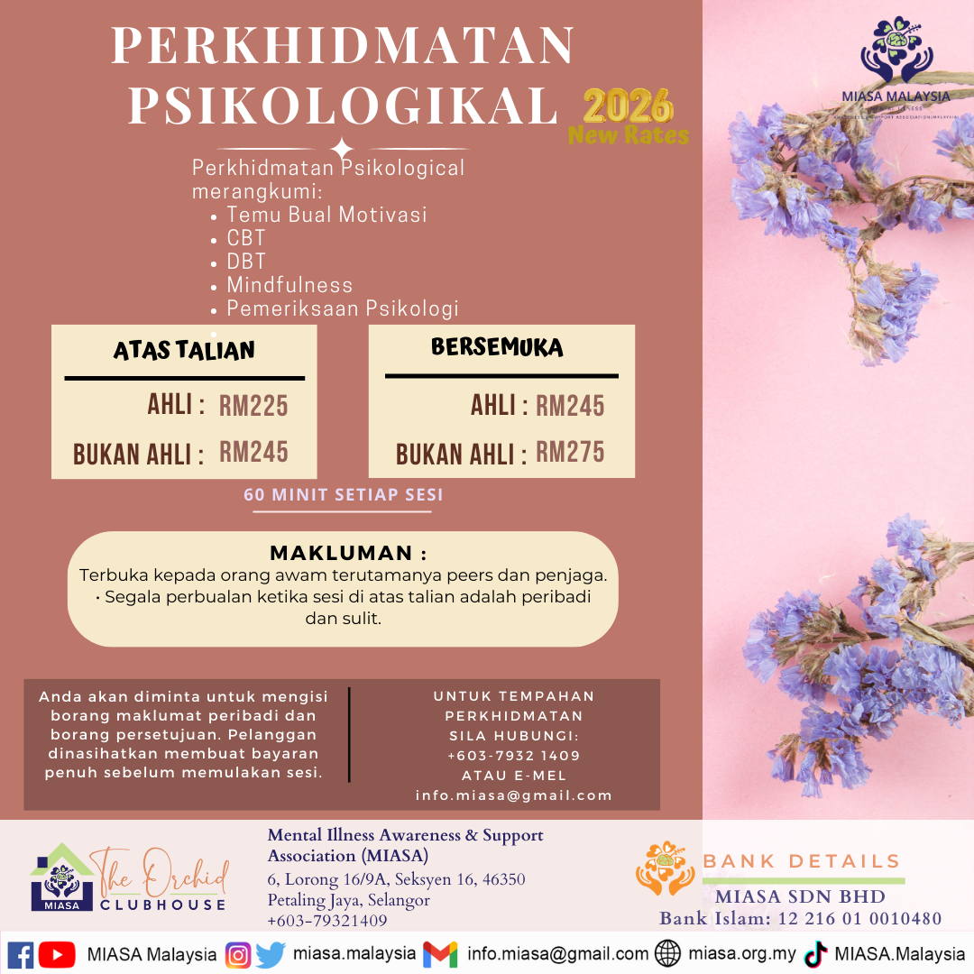 Do you feel like you are struggling to cope with your mental health and need to learn some coping mechanisms? MIASA Malaysia offers psychological services such as: CBT, Mindfulness, Psychological screening, and more.