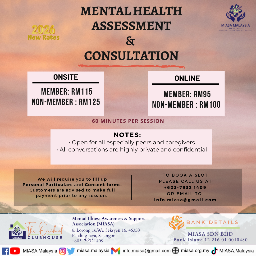 Here at MIASA Malaysia, we provide Mental Health Assessment and Consultation for those who are curious about their current mental health conditions and wishing to improve their mental health.